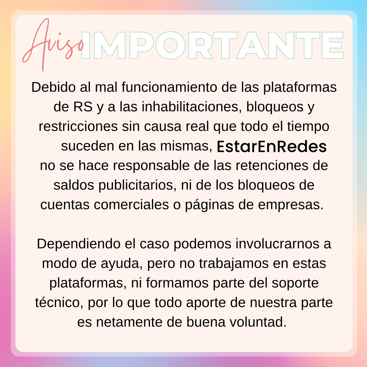 La agencia no se hace responsable de las retenciones de saldos publicitarios, ni de los bloqueos de cuentas comerciales o páginas de empresas.